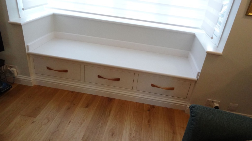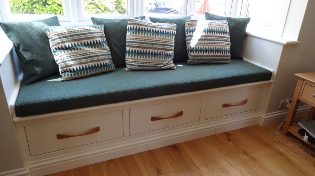 Built in 3 drawer (full extension) window seat, painted and upholstered.
