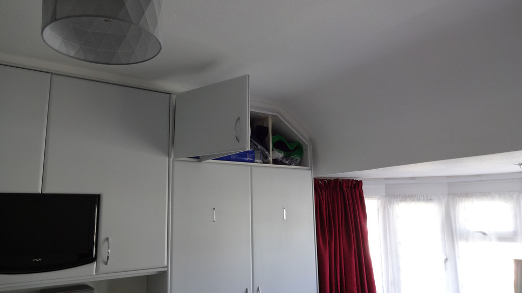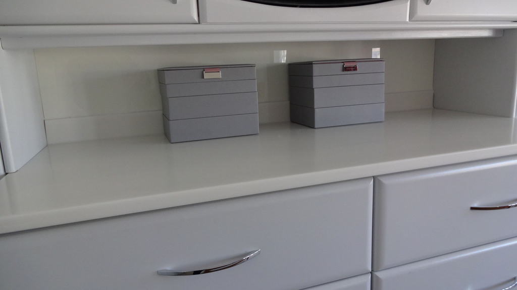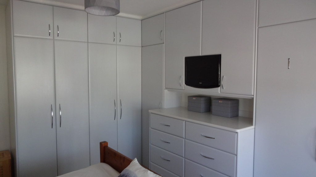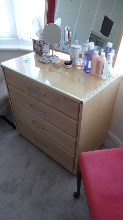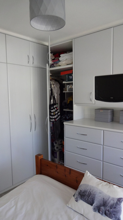 This commission was for lots of storage, wardrobes, with cabinets above and drawers, all painted. The commission was completed with contrasting Maple chest and bedside cabinets. Corian was utilised above the built in drawers.