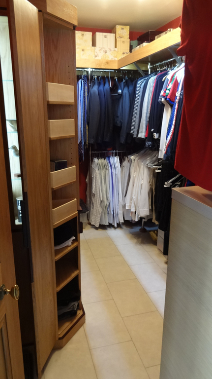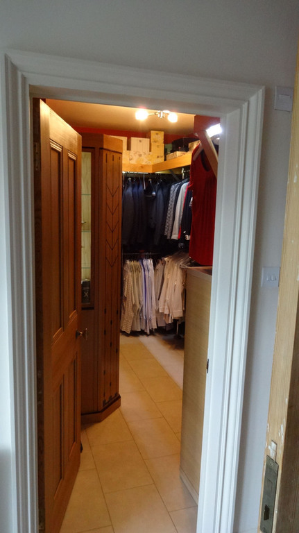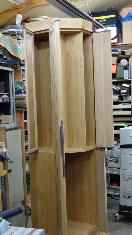 A pentagonal corner unit facing the door with 4 asymmetrical doors, incorporating illuminated display shelves, shelf storage, tie rails and small pentagonal storage boxes.