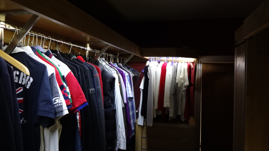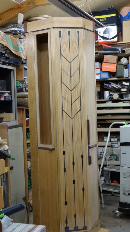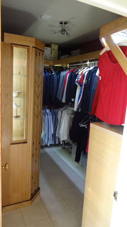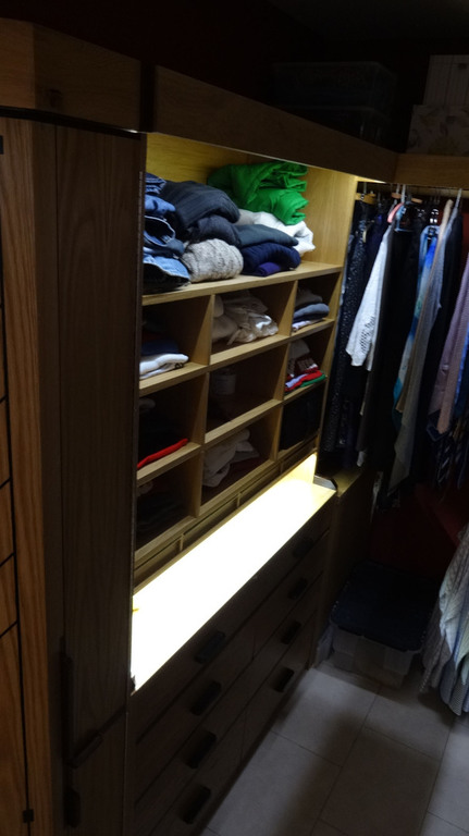 Purpose built Oak with Blackwood details. Clothes rail storage with a dresser of shelves, 4 small drawers and 8 large full extension drawers.