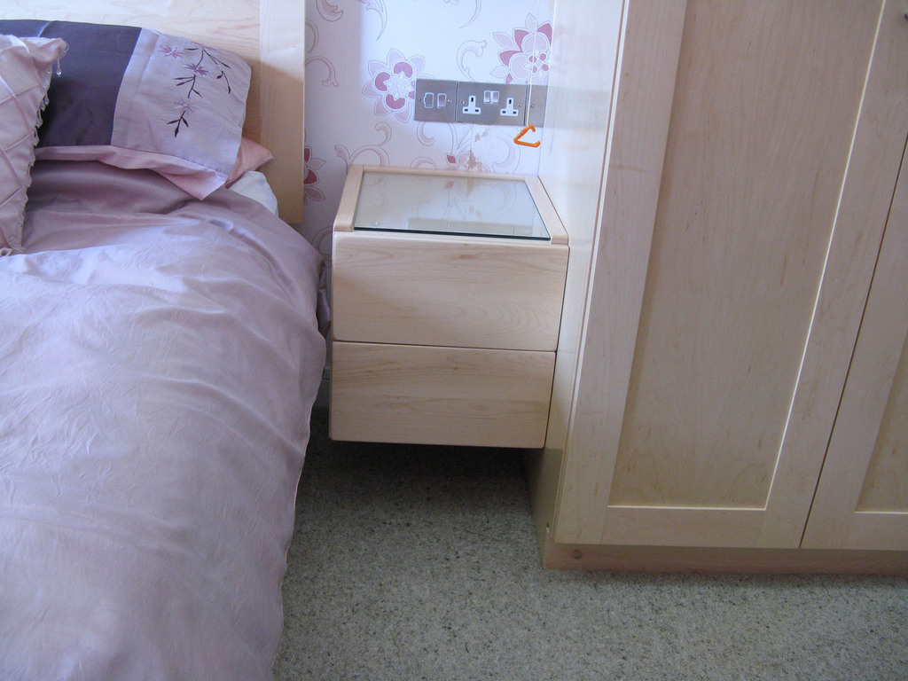 This commission was designed for a narrow room, the long wall it has a bridge unit above the bed. There are two double cabinets and a single. In one of the doubles there is only one hanging rail above a drawer and a slide for shoes. The single cabinet has 5 full extension drawers. Either side of the bed are a pair of wall hung bedside cabinets. Lighting above and under bridge with a small dresser completes the suite.