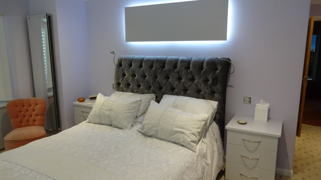 A large 4 drawer lowboy under the front aspect with a pair of bedside cabinets complete the set. I installed pelmet lighting as well as lighting inside the wardrobes.
