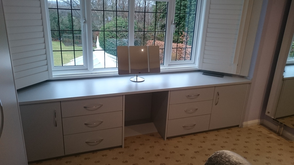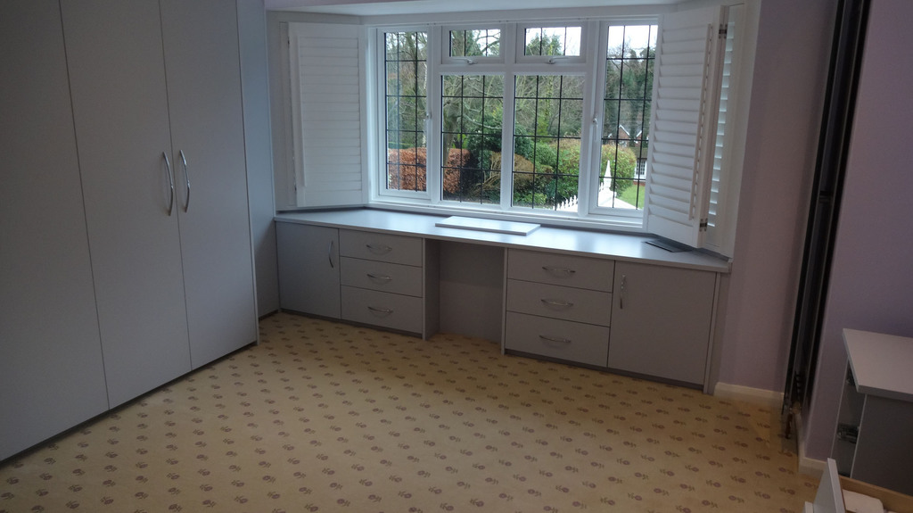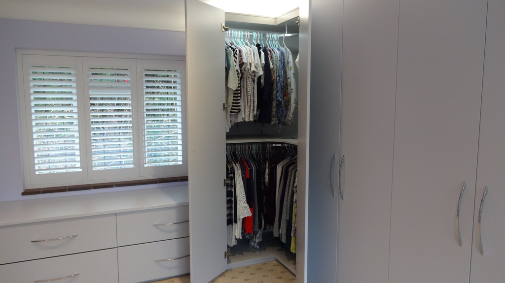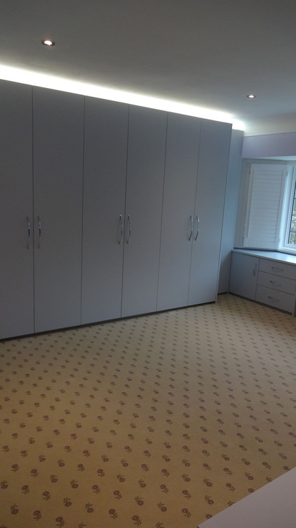 My commission for this large double aspect bedroom was to design, make and fit a mix of long and short hanging, vanity unit, and drawer units to maximise storage.