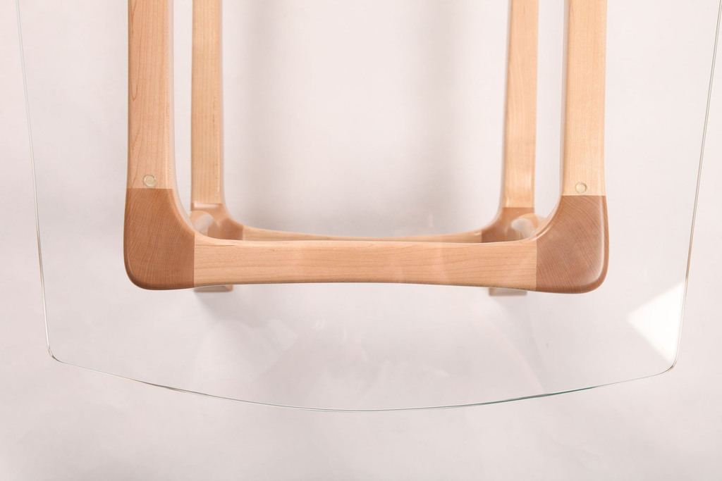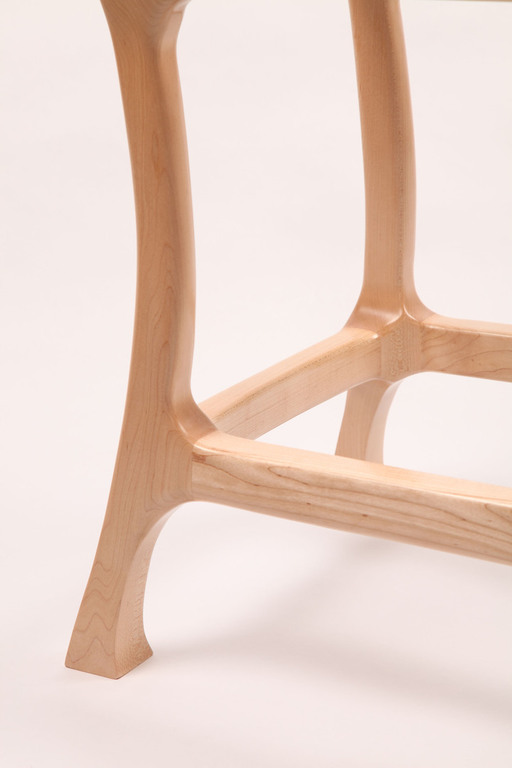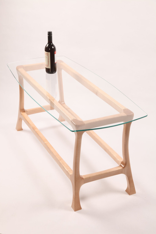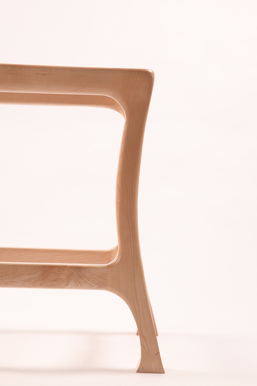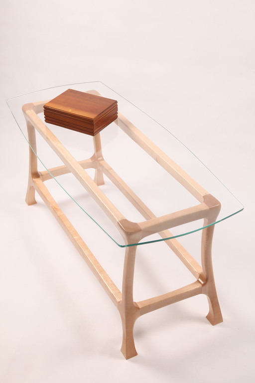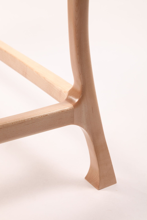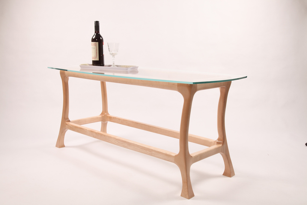 This project was one of the rare pieces that I made for my own gratification and to my own design. It has certain unusual features which make it different. It is constructed from Maple and carved to the finished symmetrical shape. The splayed legs and no straight lines enhance my idea that it looks like it has grown from the ground.