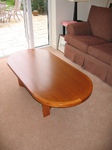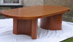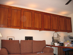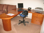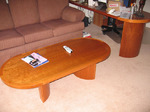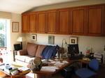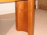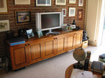 This commission consisted of an L shaped desk 2.1 mtr x 2.1 mtr, with a 4 mtr wall of cabinets above and a 2.4 mtr with a wall hung lowboy opposite. An oval coffee table completed the work. Material used was Cherry veneer with a 40 mm solid cherry lipping. The doors were solid frames with veneered panels bordered with ebony.